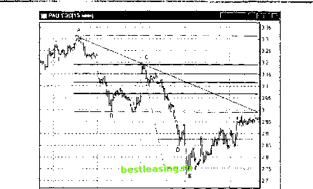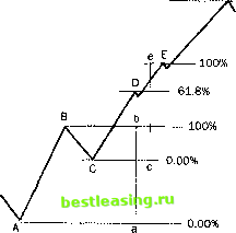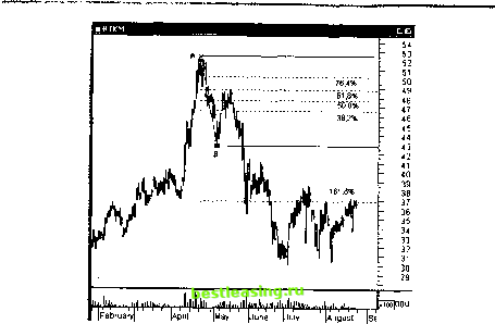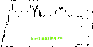 - 100% 61.8% 38.2% 0 00% Рис. 32.3. Построение уровней коррекции Фибоначчи для нисходящего движения Вновь, пусть ломаная линия ABC условно изображает движение котировок ценной бумаги. Точка А - локальный максимум цены на рассматриваемом интервале, В- минимум, а С- соответственно текущее значение цены. Видно, что цены упали с максимума А до минимума Вив настоящий момент находятся в стадии корректирующего движения. Расстояние по вертикали между максимумом и минимумом, т.е. между точками А и В, как и в случае роста, зовется рыночным размахом. Считая величину этого размаха равной 100%, можно ожидать продолжения коррекционного роста до уровней 38.2 и 61.8%. Наиболее вероятной величиной коррекции вновь является уровень 38.2%. То есть цены с большой вероятностью, поднявшись к уровню, определяемому величиной 38.2%, развернутся и возобновят падение. Если, тем не менее, рост цен продолжится, т.е. точка С преодолеет уровень 38.2%, то следующий возможный уровень сопротивления будет лежать на уровне, определяемом второй величиной коррекции Фибоначчи - 61.8%. Если, тем не менее, и этот рубеж будет взят ценами, то, по всей видимости, движение вниз исчерпано, и необходимо задуматься о смене стороны торговли с короткой на длинную. Обратите внимание, здесь в отличие от восходящего движения уровни коррекции отсчитываются снизу вверх, т.е. от минимального значения цен, которое принимается за нулевую точку. Таким образом, при нисходящем движении ценных бумаг на уровнях коррекции 38.2 и 61.8% формируют сильные уровни сопротивления, которыми можно пользоваться при выставлении лимитных ордеров на открытие коротких позиций для игры по тренду и для выставления стоп-приказов для защиты прибыли, полученной в процессе торговли в короткую сторону. Практически во всех программах технического анализа имеются инструменты, позволяющие легко получать уровни коррекции Фибоначчи. В качестве примеров ниже на рис. 32.4 и 32.3 приведены примеры того, как выглядят данные индикаторы в случае роста или падения. И МосЭнерг 3(5 мин) Г~~ р Г Vх- 0 00% ![]() 00 1200 1 300 1400 1500 1600 17 00 11 00 04 04 Чт Рис. 32.4. Построение уровней коррекции Фибоначчи по 5-минутному графику акций ОАО Мосэнерго в программе SmartTrade Хорошо виден ложный пробой первого уровня коррекции (38.2%) и последующее формирование сильной поддержки на этом уровне. Заметьте, что при построении уровней коррекции Фибоначчи необходимо правильно определить рыночный размах, который проводится из точки локального минимума в точку локального максимума соответствующих минимальных и максимальных баров. Здесь не используются цены закрытия! Здесь не используются средние цены, а точно минимум и точно максимум! На рис. 32.5 приведен другой пример построения уровней коррекций Фибоначчи для дневного графика акций ОАО Ростелеком . Вновь, как и в случае роста, для падения определяем точку максимума А и точку минимума В. Разность цен определяет рыночный размах на падении и базу (100%) для построения уровней коррекции Фибо. Видно, что цены скорректировали вверх на 61.8% до самого сильного уровня коррекции F,.. Рассмотрим, наконец, как рассчитываются расширения Фибоначчи. Для этого проанализируем схему на рис. 32.6. Предположим, мы имеем первую волну роста с рыночным размахом между локальным минимумом А и локальным максимумом В. ![]() Рис. 32.5. Построение уровней коррекции Фибоначчи для падающих цен на