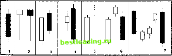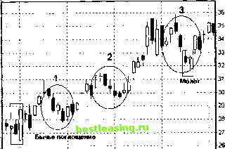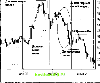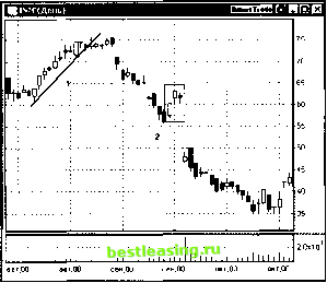 Глава 33 Комбинации японских свечей Разговор о техническом анализе будет уместно завершить материалом, посвященным анализу рынка с помощью японских свечей. Оговоримся сразу, что основные сигналы определяются комбинацией из двух свечей на основе анализа предшествующей тенденции. Третья свеча часто является подтверждающей. Отдельно рассмотренная комбинация из двух свечей, т.е. комбинация, вырванная из тенденции, может подать неверный сигнал. Если вы впервые знакомитесь с японскими свечами, то, возможно, следует вернуться к гл. 15, где даны понятия графиков, изображаемых с помощью японских свечей. Комбинации японских свечей используются для двух целей. Во-первых, они помогают распознать текущую тенденцию и определить приемлемые точки входа в длинную и короткую позиции. А во-вторых, самое главное, они предвосхищают и этим помогают выявить возможные точки разворота главной тенденции. Японские свечи как инструмент технического анализа начали применять японские торговцы фьючерсами на рис еще во времена Средневековья. В Европу и США этот инструмент проник в прошлом веке и завоевал большую популярность не только на срочных и товарных, но и на фондовых рынках, а также на рынках валют. На российском рынке в настоящее время большинство терйдеров предпочитают строить и анализировать графики японских свечей, нежели графики в барах. Такую широкую известность за десять последних лет японские свечи получили благодаря Стиву Нисону [Nison, 1994], поставившему своей целью дополнить западный техничес- кий анализ восточным . Ему удалось в многочисленных публикациях (есть издание и на русском языке [Нисон, 1994]) привнести в классический анализ Запада магические знаки и таинственные названия Востока. Большинство фигур японских свечей возникли довольно давно. Уже в средние века торговцы заметили, что хорошими точками для входа в длинную позицию при сохранении общей восходящей тенденции на рынке срочных контрактов является последовательность из четырех черных свечек. Растущий рынок редко падает более четырех дней подряд. Это правило работает и сегодня. Подтверждение этого утверждения можно найти, например, на рис. 15.8, где изображен дневной график корпорации Intel в период ее расцвета. Фрагмент этого графика мы воспроизводим на рис. 33.1. Щ 11ЧТС(День) { Г~-Г~р~ ![]() дек,98 Дек,98 дек,98 янв,99 янв,99 Рис. 33.1. Рост котировок Intel Corp. в 1998-1999 гг. сопровождался четырехдневными коррекциями, представляющими хорошие точки входа (1, 2, 3) в длинную позицию. Прямоугольниками обозначены также часто встречающиеся на растущем тренде бычьи сигналы Поглощение и Молот Хорошо видно, что если на восходящем тренде наблюдается трехдневное снижение котировок, т.е. имеются три черных свечи, то с большой вероятностью появится и четвертая черная свеча. Лучше, если все четыре свечи идут подряд. Несколько хуже выглядит комбинация трех черных свечей подряд, белой свечи и четвертой черной. В большинстве случаев покупка на четвертой день падения котировок обладает наибольшим потенциалом прибыли. Если есть уверенность в продолжении главной тенденции, то следует покупать именно на четвертой черной свече. При этом необходимо помнить и о том, что тенденции имеют свойство заканчиваться. Об этом может, например, свидетельствовать пятая, самая черная и самая страшная свеча! Ш Ростел-1 ао(День] ![]() Р