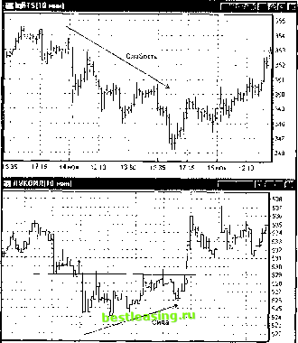 пить или продать, как обычную акцию. Такими индексами являются S&P 100 (СВОЕ: ОЕХ), DJIA (АМЕХ: DIA), S&P 500 (АМЕХ: SPY), NASDAQ-100 (АМЕХ: QQOJ и т.п. Наличие производных инструментов - большой плюс индексу. Фьючерс на S&P 500 (СВОЕ: SPX) является самым важным рыночным индикатором: он оказывается опережающим индикатором по отношению ко всем остальным индикаторам американского фондового рынка. Относительный анализ изменения индексов показывает, в какую сторону движутся деньги, из каких секторов инвесторы их выводят и в какие сектора экономики направляют. Поэтому наблюдение за поведением индекса интересующей отрасли может дать инвестору дополнительную информацию и заблаговременно предупредить о возможном развороте или начале нового тренда. Сильные и слабые акции Широко развитая индустрия западного фондового рынка предлагает инвесторам очень большое количество индексов, покрывающих различные сектора экономики. В России, к сожалению, это пока не так. Существует всего несколько индексов, известных не слишком широкому кругу инвесторов. Самым известным среди них является старейший индекс, рассчитываемый фондовой биржей РТС, который и носит одноименное название - индекс РТС (RTSI). Это индекс широкого рынка, в него входят несколько десятков* акций различных российских компаний, состав которых регулярно пересматривается. В отличие от волатильных торгуемых активов рыночный индекс движется более плавно. Он как бы нивелирует разброд в движениях голубых фишек и лучше показывает моменты разворотов и точек входа. К фондовому индексу удобнее применять технический анализ и внутри дня. Ниже мы покажем один из способов торговой стратегии, основанный на определении сильных и слабых акций. Силу и слабость ценных бумаг легче всего определить по отношению ко всему сектору, к которому они относятся, либо к рынку в целом. Поскольку, как мы выяснили, основным индикатором состояния рынка или его конкретного сектора является фондовый индекс, то, определяя силу или слабость акции, следует сравнить ее поведение либо с отраслевым индексом, либо с индексом широкого рынка. Такое сравнение дает возможность обнаружить привлекательные торговые возможности по рассматриваемой ценной бумаге. * В момент сдачи книги в состав индекса входили 59 акций российских эмитентов. индекса). Например, S&P 500 - это средневзвешенное по капитализации цен акций 500 ведущих американских компаний, деленное на некоторый фиксированный коэффициент (дивизор). Дивизор выбирается так, чтобы на момент исторического начала расчета индекса (базовая дата) его значение равнялось какому-нибудь удобному числу (базовому значению). Придание акциям разных весов в индексе делается для того, чтобы более крупные компании имели большее влияние на значение индекса, однако это не является обязательным правилом. С точки зрения качества индекса вопрос компоновки является наиболее существенным, а методика подсчета - второстепенным обстоятельством. На мировом фондовом рынке существует большое количество конкурирующих друг с другом индексов, каждый из которых в той или иной степени описывает выбранный сектор рынка. Влияние того или иного индекса на рынок определяется тем, насколько он популярен в среде инвесторов. Если, скажем, индекс, за которым следит большинство крупных инвесторов, начнет расти, это может привести к 