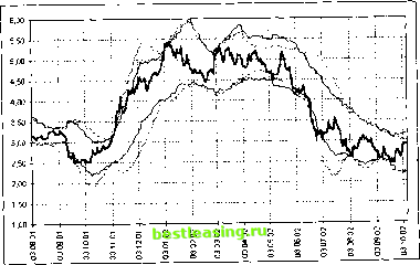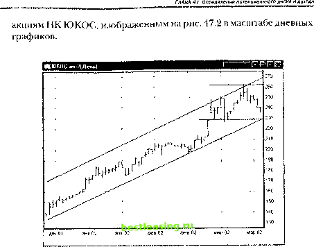 слабый уровень поддержки - 252. Выше уровня сопротивления 300 проходит наклонная линия, ограничивающая движение вниз нисходящих максимумов. Рассмотрим возможность открытия позиции 24 июля и 7 августа по цене 272 руб. за бумагу. Эти моменты показаны на рисунке двумя стрелками И в том и в другом случае риск и потенциальный доход по открываемой позиции одинаковы Разница состоит в текущей рыночной ситуации. Последняя делает открытие позиции 7 августа менее рискованным, чем 24 июля. Действительно, 7 августа цены направляются вверх, предварительно протестировав уровень поддержки Согласно формулам (47.2), потенциальный доход и убыток по текущим ценам составит: Loss = (272 - 265)/272 = 2.5%, Profit = (300 - 272)/272 = 10.3% Видно, что соотношение доход/убыток находится на приемлемом уровне и составляет более 4. Тем не менее разница в открытии позиции в первой и второй точках существенна Это связано с тем, что вероятность реализации убытка в рассматриваемых случаях разная. Следовательно, двум различным по времени точкам входа с одинаковыми ценами присущ разный риск. Этот пример показывает, что мало определить риски, необходимо их минимизировать, что достигается правильным выбором момента входа. Мы еще вернемся к этому вопросу в следующей главе Приведенные для оценок риска/убытка соотношения (47.2) неявно предполагают, что цены не выйдут из коридора, а уровни сопротивления и поддержки выбраны правильно. Далее, эти соотношения нигде не используют планируемый срок удержания позиции Единственное, что может быть сделано для правильного учета фактора времени, - это правильный выбор временной структуры графика цены и уровней поддержки и сопротивления, явно соответствующих масштабу, на котором проводится анализ В частности, если сделка планируется на срок от нескольких дней до нескольких недель, то очевидно, что анализ необходимо проводить на дневных графиках, а уровнями, полученными на часовых и 15-минутных графиках, следует пренебречь. Кроме того, в случае наличия бычьего или медвежьего тренда эти соотношения неприменимы В трендовых случаях помимо уровней поддержки/сопротивления необходимо вовлекать в рассмотрение линии поддержки/сопротивления трендов, последние локальные максимумы и минимумы. Невозможно представить общий рецепт вычисления возможных доходов и потерь. Анализ в каждом конкретном случае должен быть индивидуальным. В качестве примера приведем оценку рисков и доходов в случае открытия длинной и короткой позиций по ![]() Рис. 47.2. Пример определения потенциального риска и дохода для акций НК ЮКОС,находящиеся в восходящем тренде Здесь хорошо виден мощный восходящий тренд с периодическими консолидациями и незначительными коррекциями. С середины декабря 2001 г. до конца марта 2002 г. цены акций НК ЮКОС выросли почти в два раза - со 130 до 260 Мартовская коррекция, составившая почти 10%, вынуждает задуматься о смене тренда с восходящего на нисходящий. Последний бар на этом графике соответствует торгам 26 марта и цене закрытия 239.50. Оценим риски и потенциальные доходы при открытии длинной позиции по ценам закрытия 26 марта. Текущее значение линии поддержки восходящего тренда проходит в районе 230 руб. Чуть ниже, в районе 228.50, проходит уровень поддержки (показан горизонтальной линией). Взятие этого уровня продавцами будет означать также и пробой линии поддержки восходящег