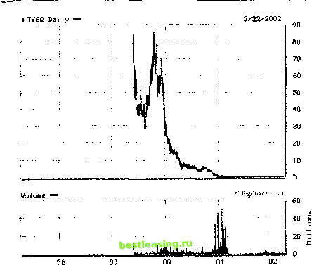 жей очень популярного детского мультипликационного сериала. Это обеспечило компании 80% общего объема прибыли. Однако, несмотря на увеличение спроса, ее ежемесячные убытки составляли около 1 млн долларов. А когда увлечение этими игрушками совсем прошло, компания пришла в упадок и в 1996 г. тоже обанкротилась. Технологическая сфера. Betamax в свое время была держа-тельницей самой современной технологии, но впоследствии уступила пальму первенства VHS. Потому что производственный цикл технологических компаний очень короткий. Запустив на рынок продукт-хит, они не всегда оказываются в состоянии повторить успех. Например, в начале 1980-х годов наблюдался стремительный взлет компании Lotus, которая разработала инновационную программу для табличных вычислений под номером 123. Но не сумев закрепить успех разработкой еще одной программы блок-бастера, фирма сначала была разорена падением курса акций, а в 1995 г. и поглощена компанией IBM в результате слишком жесткой конкуренции на рынке. Как показала практика, Интернет не стал исключением с точки зрения подверженности перепадам в увлечениях потребителей, В середине 1990-х годов широко распространилось мнение о том, что торговля станет осуществляться исключительно в онлайновом режиме. Но даже это не было действительно инновационной идеей. В середине 1980-х годов многие полагали, что все будут пользоваться телемагазииами. Этим обстоятельством и было обусловлено повышение курса акций компании Ноте Shopping Network. Ее ценные бумаги в 1986-1987 гг. выросли более чем на 1500%! Однако уже в конце октября 1987 г. у компании начались проблемы на фоне снижения интереса потребителей к ее услугам. Курс ценных бумаг снизился до 5 долларов за акцию, поскольку уменьшилось число пользователей телемагазинами. Показательным примером компании, чья деятельность напрямую зависела от моды на рынке, является eToys (рис. 5.1). В 1999 г. курс ее ценных бумаг вырос с 20 до 86 долларов за акцию. Показатель рыночной стоимости превосходил даже аналогичный показатель Toys R Us- компании, занимающей прочное положение на рынке. Однако eToys не удалось долго держать- ![]() Рис. 5.1. Кривая снижения популярности продукта eToys ся на этом уровне. С каждым кварталом росли убытки компании. Она реализовывала свой продукт по цене ниже себестоимости, а при такой практике невозможно получить прибыль. К марту 2001 г. рыночная стоимость компании снизилась до нуля. Какие же признаки опасности свидетельствуют о падении популярности продукта/услуги на рынке? Несмотря на отсутствие четкой методики такого анализа, существует несколько моментов, на которые необходимо обратить внимание. □ Компания снижает цену на свои продукты/услуги. Это означает, что спрос на них падает. Об этом свидетельствует также увеличение объемов материально-производственных запасов и дебиторской задолженности. П Усиление конкуренции на определенном сегменте рынка. В этом смысле показателен пример Snapple. Несмотря на то что подход, предусматривающий создание пищевых продуктов исключительно на натуральной основе в то время был совершенно новым, вскоре на этом сегменте рынка появилась крупная компания - производитель безалкогольных продуктов, в результате конкуренции и произошло снижение доли Snapple на рынке, □ Снижение объема прибыли. Второй признак опасности: прекращение активного расширения компании Весь