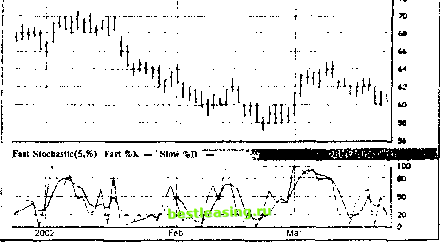 распределения тоже колеблется в диапазоне от нуля до единицы □ Если цена закрытия устанавливается ниже середины ценового диапазона но выше низшего уровня, значение линии аккумуляции/распределения колеблется в диапазоне от нуля до минус единицы. □ Если цена закрытия устанавливается в нижней части ценового диапазона, значение линии аккумуляции/распределения также равно минус единице Этот показатель умножается на объем торговли, после чего прибавляется к кумулятивному значению либо вычитается из него Это - не простая формула, но большинство ведущих финансовых сайтов специализируются на составлении чартов для посетителей на ней. Свидетельством установления на рынке понижательной тенденции может служить снижение - примерно до месяца - показателя ADL (рис 118) Microsoft СОГР fMSFT) NasJjqNat Mkt MSFT daily 22 Mar 2002 0:61 П5 H.61 14 L:60 22 C.60 45 4:20 7M Chg. 0 91 ![]() Sep Oct Nov Dec 2002 Feb Mar Рис 118 Чарт Чайкина на примере акции Microsoft Метод стохастических линий Этот метод технического анализа биржевого рынка разработал в 1950-х годах Джордж Лейн. Суть его в том, что стохастические линии показывают изменение курса акций, учитывая зону перепроданности или перекупленности , в которой находятся те или иные из них. На чарте показатели этих линий варьируются от 1 до 100. При этом выделяются два режима - быстрый и медленный стохастик. Первый характеризуется двумя линиями: %К и %D. За основу второго принимается быстрый стохастик, подвергнутый сглаживанию. И хотя быстрый стохастик в большей степени свидетельствует о понижательной тенденции на рынке, эта информация не всегда бывает объективной. Если на чарте стохастическая линия опускается ниже 20, речь идет о зоне перепроданности акций; при ее поднятии выше 80 - о зоне перекупленности. Однако это вовсе не означает, что если показатель стохастических линий определенного финансового инструмента равен 80, то инструмент нужно продавать в короткую . Нередки случаи, когда при такой ситуации цена акций продолжает расти. Особенно это касается ценных бумаг, имеющих хорошие темпы ускорения волатильности курса акций. Как использовать данные, получаемые при таком методе технического анализа? Существует распространенный принцип: сначала стохастическая линия превышает отметку 80, затем опускается ниже этого уровня, В такой ситуации продавать акции в короткую нецелесообразно. Лучше подождать, когда этот показатель повторно упадет ниже отметки 80, что служит более надежным сигналом к продаже (рис. 11.9). Полосы Боллинджера Метод данного технического анализа носит имя своего создателя - называется полосами Джона Боллинджера. Это владелец информационного бюллетеня и компании, специализирующейся на управлении финансами, который имеет свой сайт - www.bollingerbands.com. Он занимается разработкой ![]() Pwc. .Р. Быстрый и медленный стохастики торговых систем с 1977 г., когда приобрел первый компьютер; является дипломированным финансовым аналитиком и специалистом в области технического анализа рынка. Суть его метода в следующем. Еще до того, как происходит прорыв в сторону увеличения или снижения, курс любого финансового инструмента колеблется в определенном диапазоне цен. В соответствии с методом Боллинджера, берется СС за 21 день и диапазон верхней, а потом нижней полосы устанавливается на основе стандартного отклонения от СС. Работая над этой книгой, я не ставил перед собо