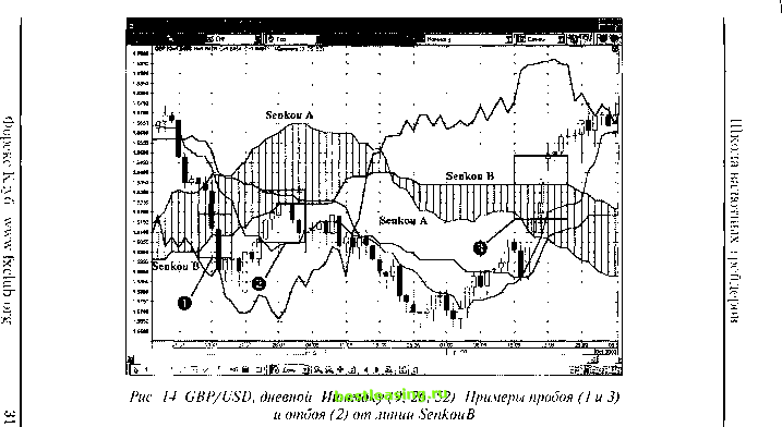 ![]() ![]() 3.2.4. Сигнал трех линий Если все линии выстраиваются в иерархической последовательности - цена - Tenkan - Kijun - облако (при этом Хосода недоверчиво относился к SenkouA), то сигналы на отбой объединяются понятием сигнал трех линий . Этот сигнал позволит использовать тренд, начало которого пропущено. Как уже говорилось, все три линии являются некоторым аналогом скользящих средних. В этом смысле Хосода не сказал ничего нового, поскольку метод выстраивания трех скользящих линий одна под другой и вход от одной из них был описан Мерфи. Хосода рекомендовал открывать позицию не просто при откате цены до линии Tenkan (или при ее пересечении - от Kijun или потом от SenkouB), а только при образовании разворотной свечи, знаменующей окончание отката. Пример сигнала трех линий приведен на рисунке 16. 1 2 3 4 5 [ 6 ] 7 8 9 10 11 12 13 14 15 16 17 18 19 20 21 22 23 24 25 26 27 |