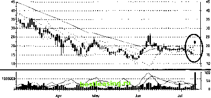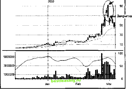 Инерционные модели Как правило, при инерционной торговле я пользуюсь двумя основными моделями. Я называю их процветающие и банкроты . (Не исключено, что зти термины покажутся вам знакомыми, поскольку они уже встречались в книге.) Эти названия - больше, нежели просто забавные ярлыки. Каждая из моделей имеет специфические торговые ожидания. Последнее важно, поскольку именно ожидания являются основой как для входа, так и для выхода из сделки. Конкретное поведение таких акций является следствием: (1) особенностей компании, (2) новостей, (3) рыночных условий и (4) настроений трейдеров. С моей точки зрения, зти модели очень надежны. Процветающие Процветающие - зто акции, которые выросли в цене примерно на 20% или более с момента закрытия предыдущей торговой сессии (16:00). Они обычно растут при хороших новостях (например, увеличение предполагаемых доходов компании), на которые рынок обычно реагирует чрезмерно. Процветающие лучше всего покупать на первом тике вверх при открытии либо шортить, когда они достигают своих максимумов (рис. 10-2). Doily ACOM-AGENCY.OOM LTDflPO) ![]() Если новость сильная, акции могут иметь значительные колебания и торговаться как с длинной, так и с короткой стороны большую часть сессии. Однако не спешите шортить процветающую бумагу: она обладает позитивной инерцией. Лучше позволить акциям достичь уровня, где начинается фиксация прибыли, и уж потом шортить. Мы рассмотрим все зто более детально на конкретных примерах далее в настоящей главе. (Исчерпывающее объяснение интерпретации новостей см. в гл. 8.) Банкроты Банкроты - зто акции, которые потеряли в цене 20% или более с момента закрытия предыдущей торговой сессии (16:00). Обычно они падают при плохих новостях (например, фактические доходы компании оказались ниже предполагаемых, слияние не состоялось), и рынок опять реагирует чрезмерно. Эти акции обычно распродаются с открытия, а затем отскакивают вверх (рис. 10-3). Так, хрестоматийным банкротом были бы акции, закрывшиеся по 20, открывшиеся по 16, распроданные до 12 и затем отскочившие вверх до 14 (отыграв 50% потерянного при падении после открытия). Daily V1SX-V1SXINC 1999 2000 ![]() ![]() ZOOOOOOfr Среди процветающих и банкротов можно выделить несколько подгрупп. Я окрестил их двойными (или тройными) процветающими и двойными (или тройными) банкротами . Двойные процветающие - это акции, выросшие более чем на 20% за два последовательных торговых дня. Двойные банкроты - с точностью до наоборот. Аналогично, тройные - зто последовательный рост или снижение котировок три дня подряд, что бывает очень редко. Цель такой маркировки состоит в том, чтобы на основе поведения акций сформировать торговые ожидания. Двойные процветающие Торговать двойными процветающими приятно (и выгодно) - зти модели очень надежны (рис. 10-4). Их появление диктуется сильными новостями и большим объемом торговли, порожденным инерцией. Daily CDTS - CONDUCTUS INC Открытие