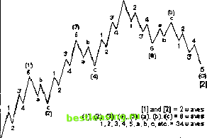 Эллиотт утаерждал (на осноае анализа данных не только финансоаого, но и политического и исторического характера], что поаедение толпы (начиная от рабоа и кончая брокерами на бирже] подчинено одним и тем же законам. С точки зрения астрологии это аполне очеаидно, да и ася теория Эллиотта пропитана астрологическими идеями (хотя, насколько изаестно, он соаершенно не был знаком с астрологией). Осноаой теории Эллиотта яаляется Волноаая Диаграмма. [1] s ![]() Табл. 7. Волна Эллиотта второго уровня В ней цикл разбиаается на дае части, пераая из которых состоит из пяти шагоа или аолн, обозначаемых цифрами 1.2.3,4,5, а аторая - из трех шагов, обозначаемых по традиции букаами А,В,С (их иногда назыаают А-аолной, В-аолной и С-волной соотаетстаенно]. При этом пять шагоа напраалены в сторону осноаного тренда, их назыаают импульсными, это -шаги с индексами 1,3,5,А и С. Шаги, направленные протиа основного тренда, назыаают корректиаными, на графике зто 2.4.В. Каждый из шагоа может быть а саою очередь разбит на 8 частей и так далее. На табл. 7 изображена аолна аторого Уровня, а которой аыделено 8 пераичных этапоа и а каждом из них по 8 аторичных. Получаем 2 большие аолны, 8 средних волн, 34 маленькие аолны. Если построить аолну третьего по- рядка, в ней будет 144 очень маленькие волны (числа 2,8,34, 144 - зто числа Фибоначчи). Теория Эллиотта дает детальное описание асех 8 основных этапов, их разновидностей, более мелких циклов, а также указывает относительную продолжительность каждого из них (при этом используются числа Фибоначчи и производные от них), причем достигается довольно высокая точность совпадения с реальным движением рынке. Считается, что погрешность тут не превосходит 10%, что, кстати, позволяет от золотого сечения перейти к числу 2/3, отличающегося от него менее чем на 10%. Также дается описание возможного взаимного расположение всех шагов каждой волны для разных поведений рынка. ![]() Табл. 8. Анализ аолн Эллиотта (программа Elliott Wave Analyser) Применение теории Эллиотта основано на универсальности восьмеричной структуры любого процесса. Если удалось устаноаить, на какой стадии находится в настоящее время изучаемый процесс (например, процесс изменения котировки акций), то, взглянув на Волноаую диаграмму, можно делать достаточно обоснованные предположения о дальнейшем его развитии. Однако точно определить зту стадию очень непросто, аедь, кроме основной волны, на наше аосприятие влияют и более мелкие волны второго и более высоких порядков. Если процесс изучается достаточно длительное время, то точность определения текущей стадии увеличивается. Но и тут при прогнозировании время от времени возникают неожиданные ситуации - процесс делает неожиданные (с точки зрения того уровня волн, которым мы ограничились) скачки. Такого рода скачки связаны с более крупными, чем были приняты нами во внимание, волнами. В результате прогнозирование в теории Эллиотта превращается в весьма трудоемкий процесс, которые далеко не всегда приводит к успеху. Существуют специальные компьютерные программы, которые могут несколько упростить этот процесс, производя все вычисления, выделяя составляющие волны и предоставляя необходимые справочные сведения о теории Эллиотта. Выше приведен пример результата работы одной из таких программ. Ясно, что астрологически теории Эллиотта соответствует 8-ричный Зоди
