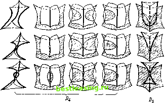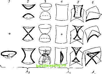 Если исходный фронт движется (зависит от параметра), то его каустика также движется и при своем движении способна испытывать метаморфозы. Метаморфозы движущихся каустик на плоскости можно изучить, рассматривая сечения большой каустики в пространстве-времени, подобно тому, как мы это делали для фронтов. Полученные ![]() ![]() / 2 г 3 % 4 Рис. 40. Типичные перестройки каустик на плоскости метаморфозы изображены на рис. 40. (Это метаморфозы плоских сечений ласточкиного хвоста, кошелька и пирамиды.) Все более сложные метрюрфозы рассыпаются на ![]() ![]() Рис. 41. Перестройка губы : рождение видимого контура Рис. 42. Перестройка плоского сечения поверхности с ребром возврата последовательности перечисленных при малом шевелении однопараметрического семейства. Обратим внимание на метаморфозу 1 рождения каустики из воздуха , Новорожденная каустика имеет вид серпика с полукубическими остриями из концах ( губы , но терминологии Р. Тома), Аналогичным образом рождается ия воздуха видимый контур поверхности при изменении направления проектирования (рис, 41), Глядя на бугор сверху, мы не видим контура. Когда луч зрения наклоняется, появляется вначале точечная особенность, которая затем быстро растет (пропорционально t - tm где t0 - момент появления особенности) и имеет вид губ . Описанную здесь перестройку можно реализовать как перестройку плоского сечения поверхности с ребром возврата при поступательном движении плоскости (в момент перестройки плоскость касается ребра возврата (рис. 42)). Рис. 43. Перестройка верблюд Метаморфозу 3 также можно увидеть на видимом контуре, для этого достаточно посмотреть на двугорбого верблюда, проходя мимо него (рис. 43). В момент метаморфозы профиль имеет такую же особенность, как кривая уд = xi. Все перестройки видимых контуров поверхностей в общих однопараметрических семействах исчерпываются первыми тремя изображенными на рис. 40, 1-3. Метаморфозы каустик, движущихся в трехмерном пространстве, получаются сечениями больших (трехмерных) каустик в четырехмерном пространстве-времени трехмерными изохронами. Эти метаморфозы изображены на рис. 44 и 45. Одна из этих метаморфоз (/) описывает рождение новой каустики из воздуха . Мы видим, что вновь родившаяся каустика имеет вид блюдца с заостренными краями. Через время t после рождения длина и ширина блюдца порядка Ytx глубина порядка t, а толщина порядка t y~t. Каустика может сделаться видимой, если на пути светового пучка имеется рассеивающая среда (пыль, туман). В. М. Закалюкин предположил, что каустики этого вида наблюдатели описывают как летающие блюдца. Ребра возврата движущихся в трехмерном пространстве каустик заметают поверхность бикаустики. Особенности бикаустик общего положения, соответствующих раз-яичным метаморфозам рис. 44 и 45, изображены на рис. 46. Как известно, лучи описывак>т распространение волн (скажем, световых) лишь в первом приближении; при более точном волновом описании появляется новый ![]() Рис. 44. Типичные перестройки каустик в трехмерном пространстве: серия А 7 8 9 )0 11 ![]() Рис. 45. Типичные перестройки каустик в трехмерном пространстве: серия D 1 2 3 4 5 6 7 8 9 10 [ 11 ] 12 13 14 15 16 17 18 19 20 21 22 23 24 25 26 27 28 29 30 31 32 33 |