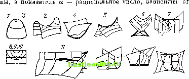 существенный параметр - длина волны (лучевое описание пригодно лишь в случае, когда эта длина мала по сравнению с характерным геометрическим размером системы). Интенсивность света вблизи каустики больше, а вблизи ее особенностей еще больше. Коэффициент усиления оказывается пропорциональным 1~~а, где I - длина вол- ![]() Рис. 46. Типичные особенности бикаустик характера особенности. Для простейших особенностей значения а таковы: