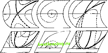 ляемого индикатрисой набора допустимых скоростей, достичь заданной цели (например, прийти за кратчайшее время на заданное подмножество фазового пространства). Зависимость кратчайшего времени достижения цели от начальной точки может иметь особенности. Рассматривавшиеся в п. 10 особенности функции минимума расстояния до кривой - частный случай (индикатриса - окружность, а цель - кривая). В отличие от этого частного случая особенности кратчайшего времени в общей задаче управления изучены весьма слабо. В общем случае достичь цели можно не при любом начальном условии. Точки фазового пространства, из которых можно достичь цели (за любое время), называются областью достижимости. Граница области достижимости может иметь особенности даже в том случае, Рис 54. Поле индикатрис до-когда ни цель, ни поле ин- llJ дикатрис в различных точках фазового пространства особенностей не имеют. Мы приводим ниже классификацию особенностей границы достижимости в общей управляемой системе на фазовой плоскости в случае, когда индикатрисы и цель - гладкие кривые (по А. А. Давыдову). Из четырех типов особенностей границы три записываются простыми формулами (при подходящем выборе локальных координат на плоскости): 1) у = х , 2) у = х х , 3) у = хг х . Особенность четвертого типа связана с теорией дифференциальных уравнений, неразрешенных относительно производной, называемых также неявными дифференциальными уравнениями. Такое уравнение имеет вид F (х, у, р) = 0, где р == = dy/dx. Геометрически уравнение F = 0 задает поверхность в трехмерном пространстве с координатами (х, у, р). Она называется поверхностью уравнения. Условие р = dy/dx выделяет плоскость в каждой точке нашего трехмерного пространства. Эта плоскость состоит из векторов, г/-компонента которых в р раз больше х-компонентыа где р - координата точки приложения. Та- ![]() кая плоскость называется контактной. Контактная плоскость в каждой точке вертикальна (содержит направление оси р). Все вместе контактные плоскости задают поле контактных плоскостей, называемое также контактной структурой. Контактная структура высекает на поверхности уравнения поле направлений (с особыми точками в тех местах, где контактная плоскость касается поверхности). Поверхность уравнения здесь предполагается гладкой. Это условие выполняется для уравнений общего положения. Вопрос о строении типичных особых точек неявных дифференциальных уравнений рассматривался еще в прошлом веке, и король Швеции Оскар II включил его, наряду с проблемой трех тел, в список из четырех вопросов на премию 1885 г. Решение этого вопроса было получено лишь в 1985 г. А. А. Давыдовым в виде побочного продукта исследования областей достижимости управляемых систем на плоскости. Ответ доставляет следующий список нормальных форм (к которым уравнение приводится локальным диффеоморфизмом плоскостп): у = (х + kpY. В зависимости от значения параметра к здесь возможны три случая. Особая точка поля на поверхности уравнения может оказаться седлом, узлом или фокусом. Отображение проектирования поверхности уравнения на плоскость (х, у) вдоль оси р имеет особенностью складку. В окрестности типичной точки складки уравнение приводится к нормальной форме Чибрарио (1932), х = р2. Все особые точки автоматически попадают на складку. Результат складывания изображен на рис. 55: особые точки на плоскос