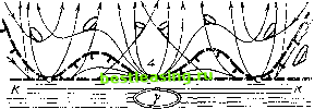 Для систем общего положения такое событие происходит лишь в отдельных точках границы К области полной управляемости. На рис. 58 оно происходит в точке 3, где касательная к К горизонтальна. Из сказанного выше ясно, что описанное событие реализуется устойчивым образом: при малом шевелении системы, т. е. цели и поля индикатрис допустимых скоростей, точка 3 несколько сместится, но не исчезнет. Рассмотрим теперь сеть предельных линий вблизи точки 3. Оба поля предельных направлений вблизи нее гладкие. Выбором соответствующей системы координат одно из них можно выпрямить. На рис. 58 система координат так и выбрана: первое из двух семейств предельных линий состоит из горизонтальных прямых (направленных влево). Линии второго семейства - гладкие кривые. На кривой К они касаются линий первого семейства. В интересующей нас точке 3 оба семейства касаются линии К. Из этих соображений уже нетрудно усмотреть, что сеть предельных линий вблизи точки 3 выглядит так, как указано на рис. 58: выше кривой К линии второго семейства поднимаются при движении вдоль допустимого направления, ниже - опускаются (выбор направлений линий сети допускает еще несколько вариантов, аналогичных изображенному; разобравшись в рис. 58, читатель легко разберется в них сам). Теперь на рис. 58 видно, что левее точки 3 граница области дос ги-жимости идет по линии второго предельного направления, a j:> а-вее - первого (горизонтального). В точке 3 обе линии имеют второй порядок касания (как прямая и кубическая парабола). В окр-ст-ности этой точки граница достижимости диффеоморфна *) графику функции у - 1г х \. Таким образом, точки 1 и 2 на рис. 57 и точка 3 на рис. 58 д от примеры устойчиво реализуемых событий на границе области досли- Рис. 59. Сложенные особенности на границе области достижимости жимости, вызывающих особенности первых трех видов с. 49. Особенности четвертого вида возникают в ситуации рис. 59. На этом рисунке, как и на рис. 58, цель находится внутри заштрихованной области полной управляемости. На границе К этой области расположены точки плоскости, в которых выпуклая индикатриса проходит через нуль. Ясно, что в управляемых си- *) Диффеоморфизм - это замена координат, гладкая вместе с обратной заменой, ![]() стемах общего положения это явление - прохождение индикатрисы через 0 - реализуется на линии. По одну сторону этой линии К лежит область полной управляемости (индикатриса окружает 0), по другую - область с двумя предельными направлениями. На разделяющей их границе К оба эти ноля направлений сливаются в одно - поле направлений касательных к индикатрисам в нуле. В общей точке кривой К направление этого поля составляет с К ненулевой угол. Событие, приводящее к особенности четвертого типа на границе области достижимости,- это касание кривой К с предельным направлением. Для систем общего положения такое касание реализуется в отдельных точках границы области полной управляемости Я . На рис. 59 таких точек на кривой К три; средняя из них обозначена цифрой 4. Чтобы изучить сеть предельных линий в окрестностях этих особых точек, полезно рассмотреть наше двузначное поле предельных направлений как однозначное поле направлений на поверхности, двулистно накрывающей область выше кривой К. С этой целью рассмотрим множество всех направлений линейных элементов на плоскости. Это множество является трехмерн