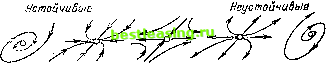 Пользуясь этим рисунком, можно переходить с одного места поверхности равновесий на другое без скачков. Схема большинства применений теории катастроф такая же, как в описанных примерах. Предполагается, что изучаемый процесс описывается при помощи некоторого числа управляющих и внутренних параметров. Состояния равновесия процесса образуют поверхность того или иного числа измерений в этом пространстве. Проекция поверхности равновесий на плоскость управляющих параметров может иметь особенности. Предполагается, что это - особенности общего положения. В таком случае теория особенностей предсказывает геометрию катастроф , т. е. перескоков из одного состояния равновесия в другое при изменении управляющих параметров. В большинстве серьезных приложений особенность - это сб-.рка Уитни, а результат был известен до провозглашения теории катастроф. Приложения описанного типа бывают более или менее обоснованными в зависимости от степени обоснованности исходных посылок. Например, в теории хлопков упругих конструкций и в теории опрокидывания кораблей предсказания теории полностью подтверждаются экспериментом. С другой стороны, в биологии, психологии и социальных науках (скажем, в приложениях к теории поведения биржевых игроков или к изучению нервных болезней) как исходные предпосылки, так и выводы имеют скорее эвристическое значение. 5. БИФУРКАЦИИ ПОЛОЖЕНИЙ РАВНОВЕСИЯ Эволюционный процесс математически описывается векторным полем в фазовом пространстве. Точка фазового пространства задает состояние системы. Приложенный в этой точке вектор указывает скорость изменения состояния. В некоторых точках вектор может обращаться в нуль. Такие точки называются положениями равновесия (состояние не меняется с течением времени). На рис. 10 изображено фазовое пространство системы, описывающей взаимоотношение хищника и жертвы (скажем, щук и карасей), Фазовое пространство - положительный квадрант плоскости. По оси абсцисс отложено число карасей, по осе ординат - щук. Точка Р - положение равновесия. Точка А соответствует равновесному количеству карасей при количество щук, меньшем равновесного. Видно, что с течением времени в системе устанавливаются колебания; равновесное состояние рис. 10 неустойчиво. Установившиеся колебания изображаются замкнутой кривой на фазовой плоскости. Эта кривая называется предельным циклом. Кривые в фазовом пространстве, образованные последовательными состояниями процесса, называются фазовыми кривыми. В окрестности точки, н;> являющейся положением равновесия, разбиение фазового пространства на фазовые кривые устроено так же, как разбиение на параллель- i. ные прямые: семейство фазовых кривых можно превратить в семейство параллельных прямых гладкой заменой координат. В окрестности положения равновесия картина сложнее. Как показал еще А. Пуанкаре, поведение фазовых кривых в окрестности по- L ложения равновесия на фазовой n .n * Рис 10. Фазовая плос- плоскости в системе общего поло- кость модели хищник-жения такое, как изображено на жертва рис. 11. Все более сложные случаи превращаются в указанные при общем малом изменении системы. Системы, описывающие реальные эволюционные процессы, как правило, общего положения. Действительно, такая система всегда зависит от параметров, которые ![]() Фокуо Из ел Седло Узел Фокс/о 